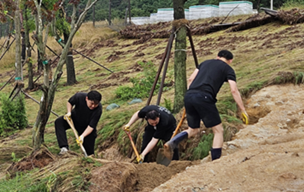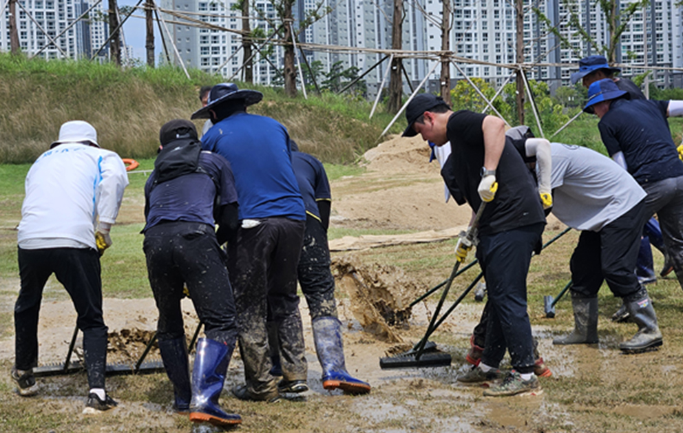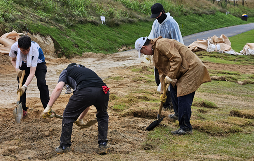 지난 7월 18일, 충남지역 집중호우로 인해 내포골프클럽이 예상치 못한 수해 피해를 입었다. 갑작스러운 폭우로 코스 일부가 침수되고 시설이 훼손되는 등 운영에 큰 차질이 우려되었으나, 대주·KC 임직원들이 신속히 힘을 모아 코스 배수작업, 토사 제거, 시설물 정비 등 적극 복구 작업에 나선 덕분에 피해 규모를 최소화하고 빠른 정상화를 이끌어낼 수 있었다. 복구 작업은 피해 발생 직후인 18일부터 21일까지 나흘간 진행되었다.