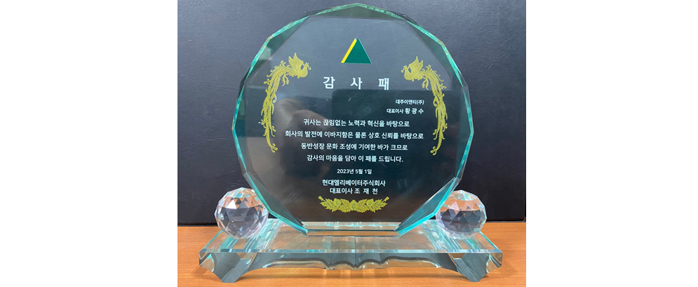 5월 1일 대주이엔티 엘리베이터사업부는 현대엘리베이터로부터 상호신뢰를 바탕으로 동반성장 문화를 조성한 공로를 인정받아 감사패를 수여받았다.