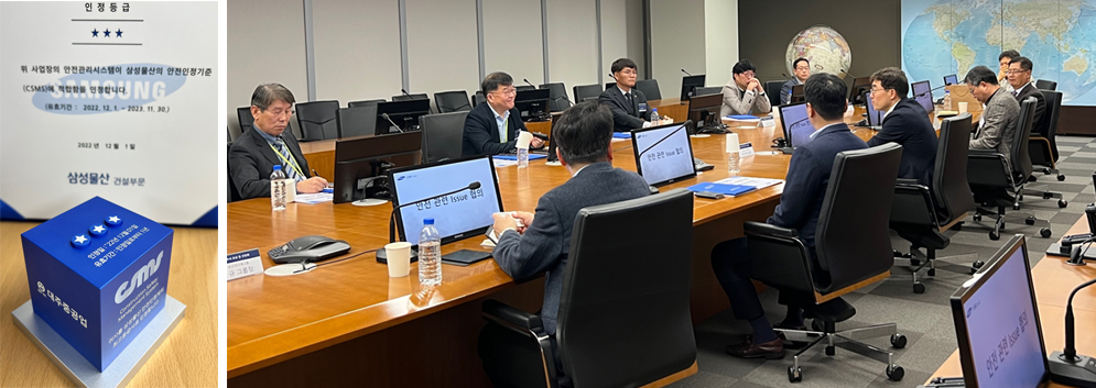 3월 9일 대주중공업 철구사업부는 삼성물산 본사에서 진행된 ’23년 안전 우수사 포상 및 간담회’에서 삼성형 안전시스템 인정제도(CSMS) 기준에 적합함을 인정받아 최고등급인 ‘3star’를 취득하였다.