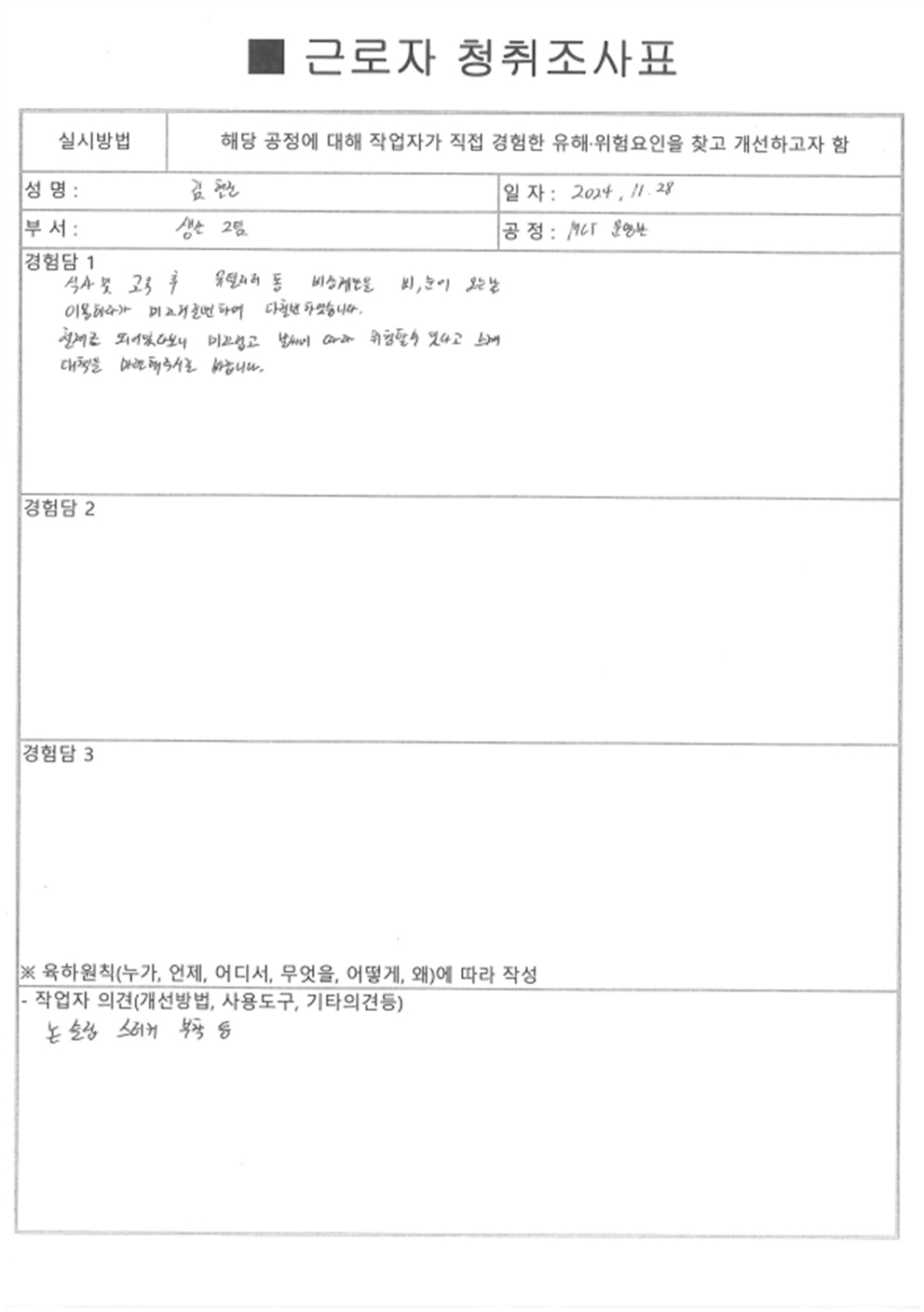 두 번째 사례는 ‘근로자 참여 중심의 실효성 있는 위험성 평가 시행’이다. 중대재해처벌법 및 산업안전보건법의 개정에 따라, 단순한 형식적 평가가 아닌 근로자가 실제로 체감하고 이해하는 위험성 평가 체계가 요구됨에 따라 대주코레스는 ▲외부 전문강사 초빙 교육을 통해 평가 방법론에 대한 현장 숙련도 향상 ▲현장 의견 청취조사표를 활용한 의견 수렴 체계 마련 ▲’안전 소리함‘ 및 ‘안전 밴드’를 통한 상시 피드백 구조 마련 등 근로자의 자발적 참여를 기반으로 하는 안전관리 체계를 완성하며, 구성원이 스스로 위험요인을 파악하고 개선해 나가는 지속가능한 안전문화 기반을 조성했다는 점에서 의미가 깊다.