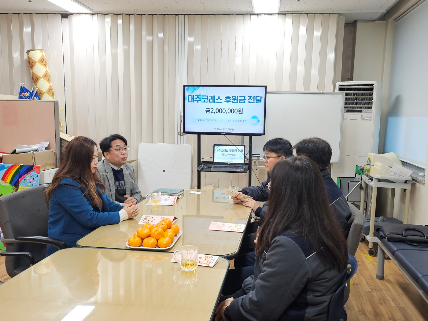 12월 22일 대주코레스는 완주군장애인복지관에서 한마음봉사단과 함께 후원금 전달식을 개최하고, 저소득 장애인을 위한 후원금 200만 원을 전달하였다.