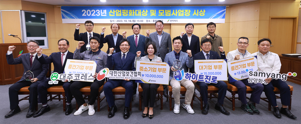10월 16일 대주코레스는 전라북도에서 주최한 ‘2023년 산업평화대상 및 모범사업장 시상식’에서 선진 노사문화 구축으로 기업의 경쟁력을 높이고 산업평화 정착에 기여한 공로를 인정 받아 모범사업장으로 선정되어 수상의 영예를 안았다.