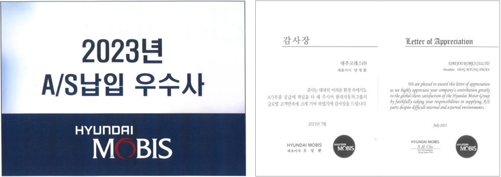 7월 18일 대주코레스는 현대모비스로부터 대내외 어려운 환경 속에서도 우수한 품질의 A/S부품을 적기에 공급한 공로를 인정받아 2023년 A/S납입 우수사 선정 및 감사장을 수여받았다.