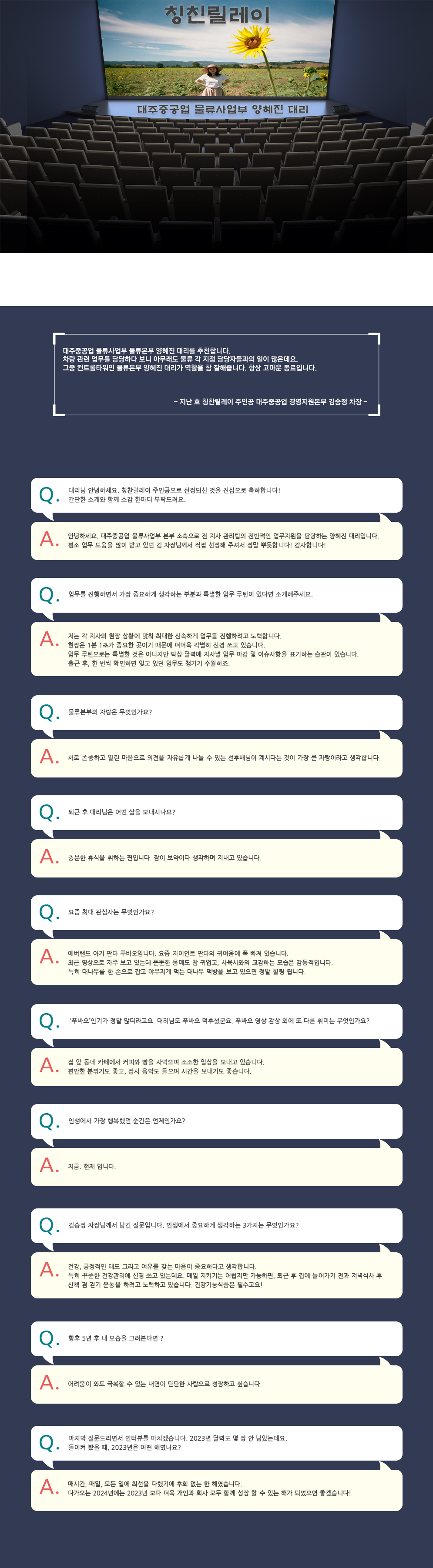 우리들의 이야기/왓츠 인 마이 대주 양혜진 대리 대주·KC 운영자 2023. 10. 26. 15:57 대주중공업 물류사업부 양혜진 대리 공유하기 게시글 관리 DAEJOO·KC company magazine 저작자표시 비영리 변경금지 (새창열림) '우리들의 이야기 > 왓츠 인 마이 대주' 카테고리의 다른 글 정택근 과장 (0) 2024.03.04 최대봉 대리 (0) 2023.12.27 김승정 차장 (1) 2023.08.29 박정훈 대리 (0) 2023.06.27 이산 대리 (2) 2023.04.25 티스토리툴바 DAEJOO·KC company magazine구독하기
