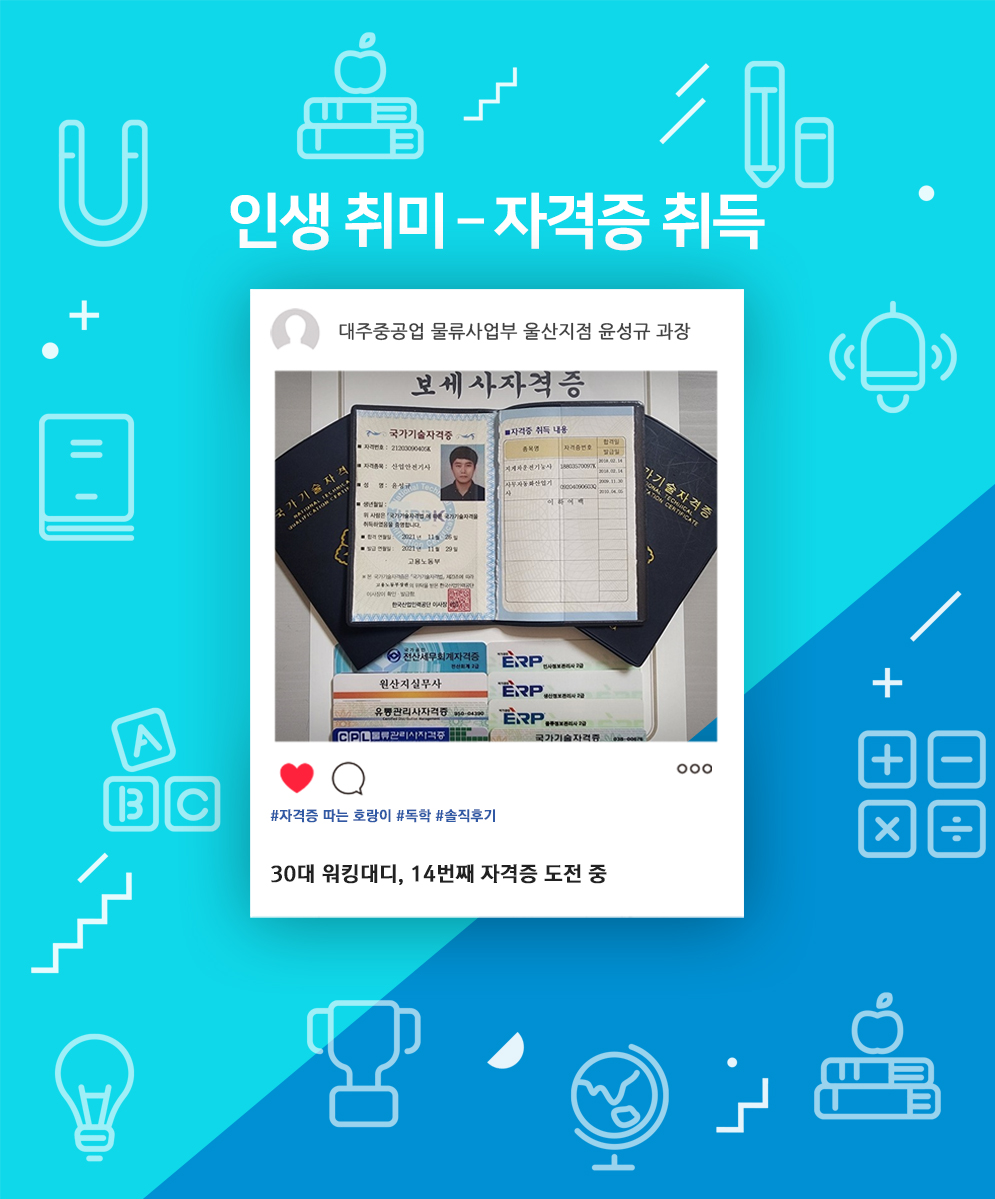 퇴근 후 시간을 값지게 보내고 싶어 시작한 자격증 취득이 취미가 되었습니다.