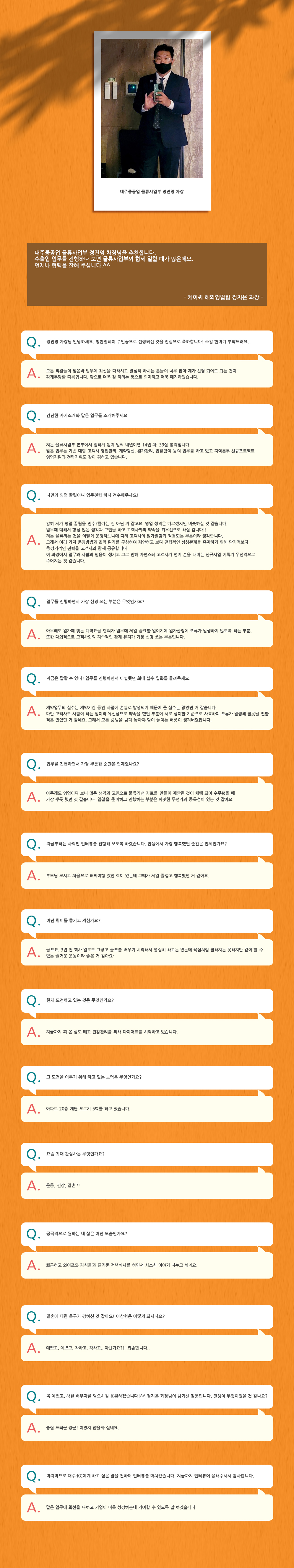 우리들의 이야기/왓츠 인 마이 대주 정진영 차장 대주·KC 운영자 2022. 10. 25. 13:26 대주중공업 물류사업부 정진영 차장 공유하기 게시글 관리 DAEJOO·KC company magazine 저작자표시 비영리 변경금지 (새창열림) '우리들의 이야기 > 왓츠 인 마이 대주' 카테고리의 다른 글 이정민 사원 (3) 2023.02.22 최혜미 대리 (0) 2022.12.28 정지은 과장 (0) 2022.08.30 도현정 과장 (0) 2022.06.28 고철권 대리 (0) 2022.02.18 티스토리툴바 DAEJOO·KC company magazine구독하기