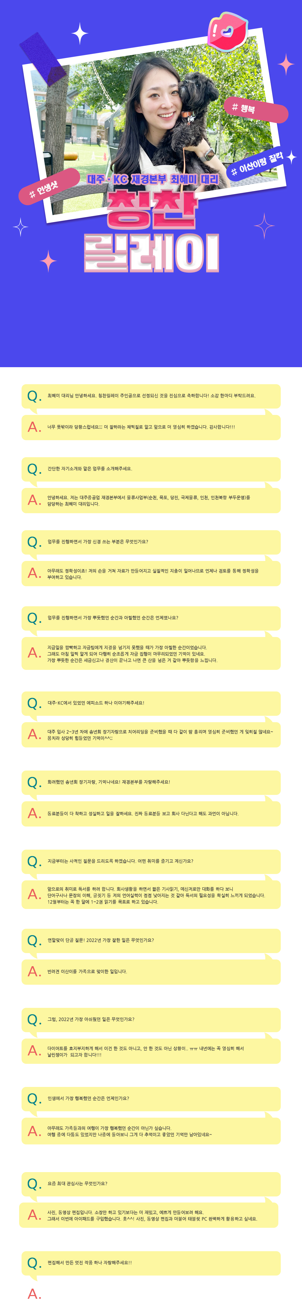 우리들의 이야기/왓츠 인 마이 대주 최혜미 대리 대주·KC 운영자 2022. 12. 28. 09:52 대주·KC 재경본부 최혜미 대리 공유하기 게시글 관리 DAEJOO·KC company magazine 저작자표시 비영리 변경금지 (새창열림) '우리들의 이야기 > 왓츠 인 마이 대주' 카테고리의 다른 글 이산 대리 (2) 2023.04.25 이정민 사원 (3) 2023.02.22 정진영 차장 (0) 2022.10.25 정지은 과장 (0) 2022.08.30 도현정 과장 (0) 2022.06.28 티스토리툴바 DAEJOO·KC company magazine구독하기