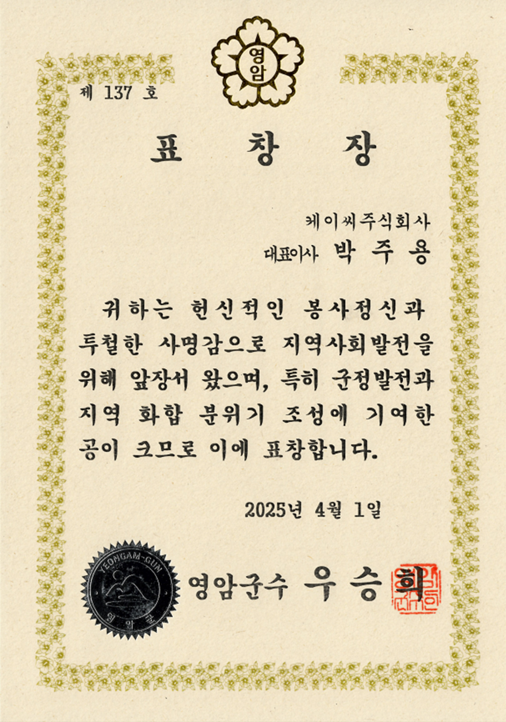 4월 1일 케이씨는 영암군으로부터 지속적인 지역사회 기여와 기업·지자체 간 상생 협력에 대한 공로를 인정받아 ‘우수기업 대표 표창’수상의 영예를 안았다.