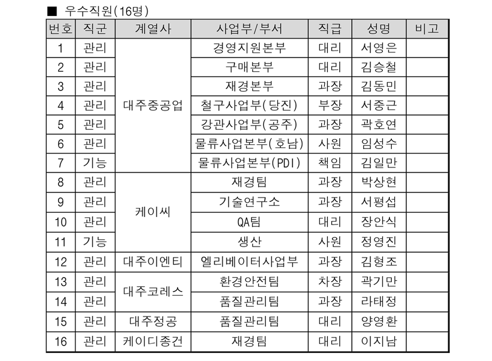 | 대주코레스, 노사화합 행사 ‘별(別)별(Star)챌린지’ 개최 (0) | 2024.03.04 |