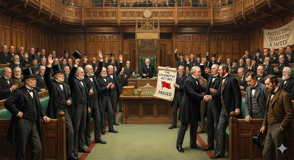 결국 영국 의회는 1865년, 세계 자동차 역사상 가장 악명 높은 법안인 기관차법(The Locomotive Act),