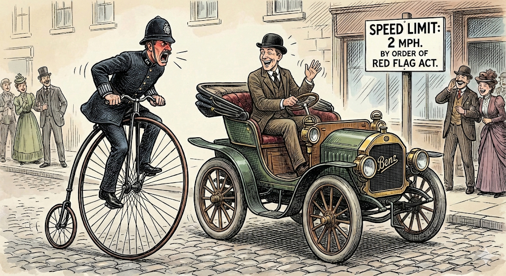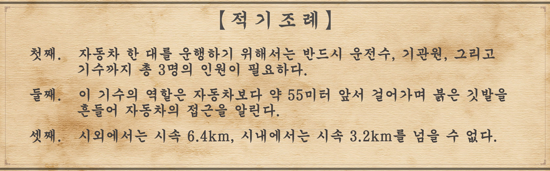 즉, 이 법은 “자동차는 절대로 사람보다 빨리 달려서는 안 된다”라고 법으로 못 박은 것입니다.